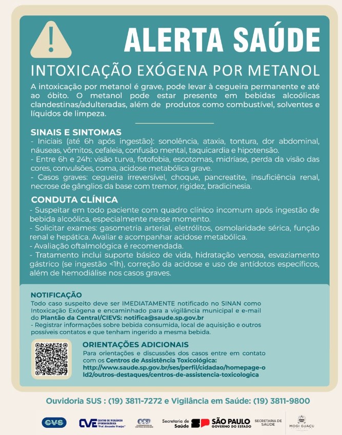A Vigilância em Saúde do município emitiu alerta para os riscos do consumo de bebidas alcoólicas adulteradas com metanol, álcool altamente tóxico usado em combustíveis, solventes e produtos de limpeza. O aviso reforça que consumidores devem comprar apenas de fornecedores legalizados e observar lacres, rótulos e selo fiscal. Até a última atualização desta reportagem, não há registro de casos em Mogi Guaçu. Bares e restaurantes locais vêm usando as redes sociais para reafirmar a procedência das bebidas; o Cerâmica Clube, por exemplo, suspendeu a venda de destilados por precaução.